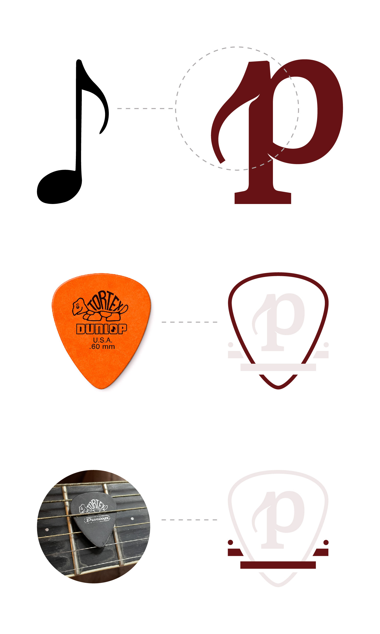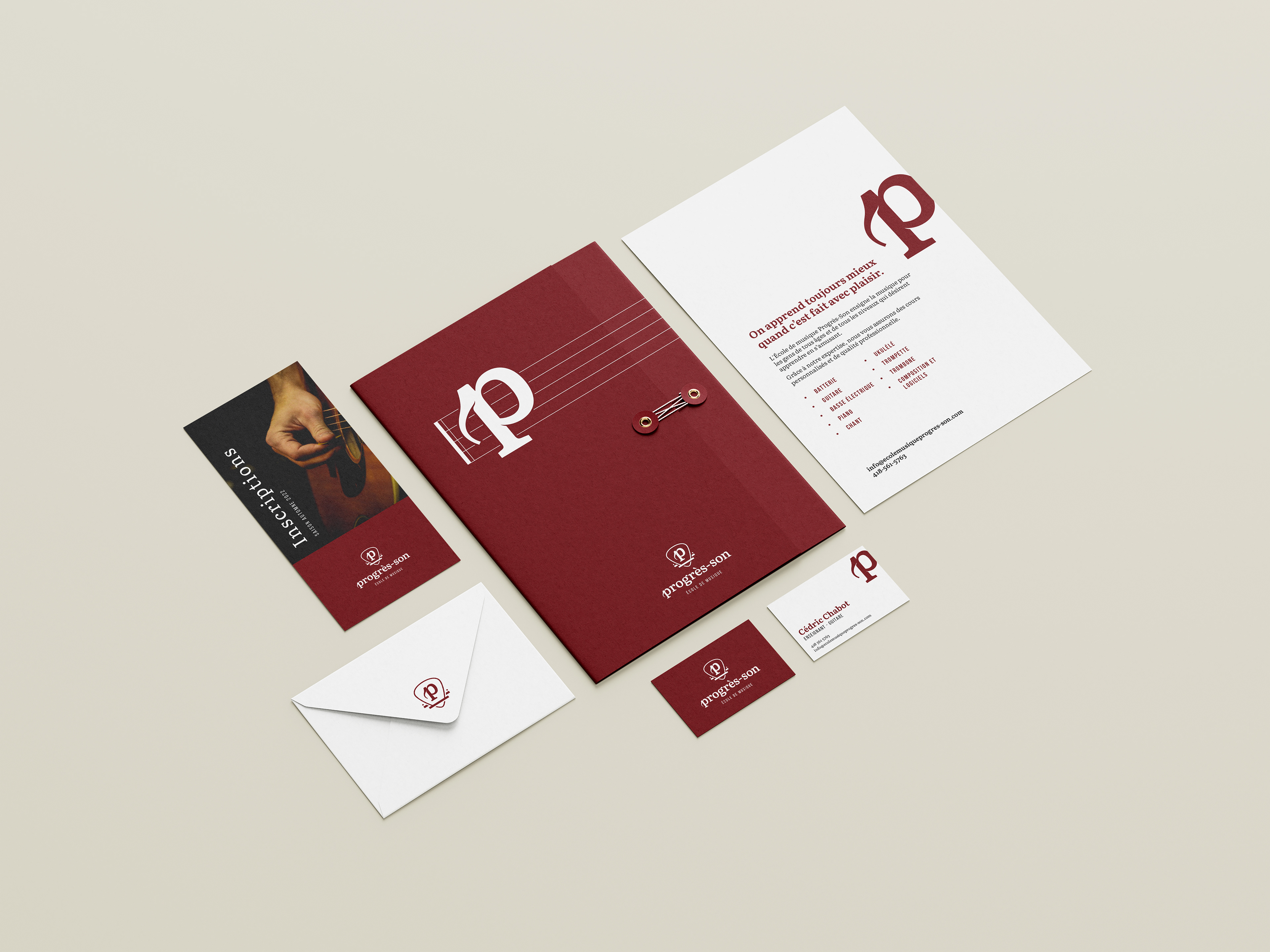 Ce projet de branding s’appuie sur une palette bourgogne et blanche qui évoque à la fois la chaleur de la musique et le sérieux d’un enseignement structuré. La lettre p, traitée comme un symbole typographique fort, devient l’élément central de l’identité et se décline sur la papeterie, la carte d’affaires et le médiator pour assurer une reconnaissance immédiate. Les lignes graphiques inspirées des cordes d’instrument structurent les compositions et rappellent visuellement l’univers musical de l’école. L’ensemble des supports est conçu de façon minimaliste afin de laisser toute la place au logo et aux informations essentielles, tout en projetant une image professionnelle et cohérente.