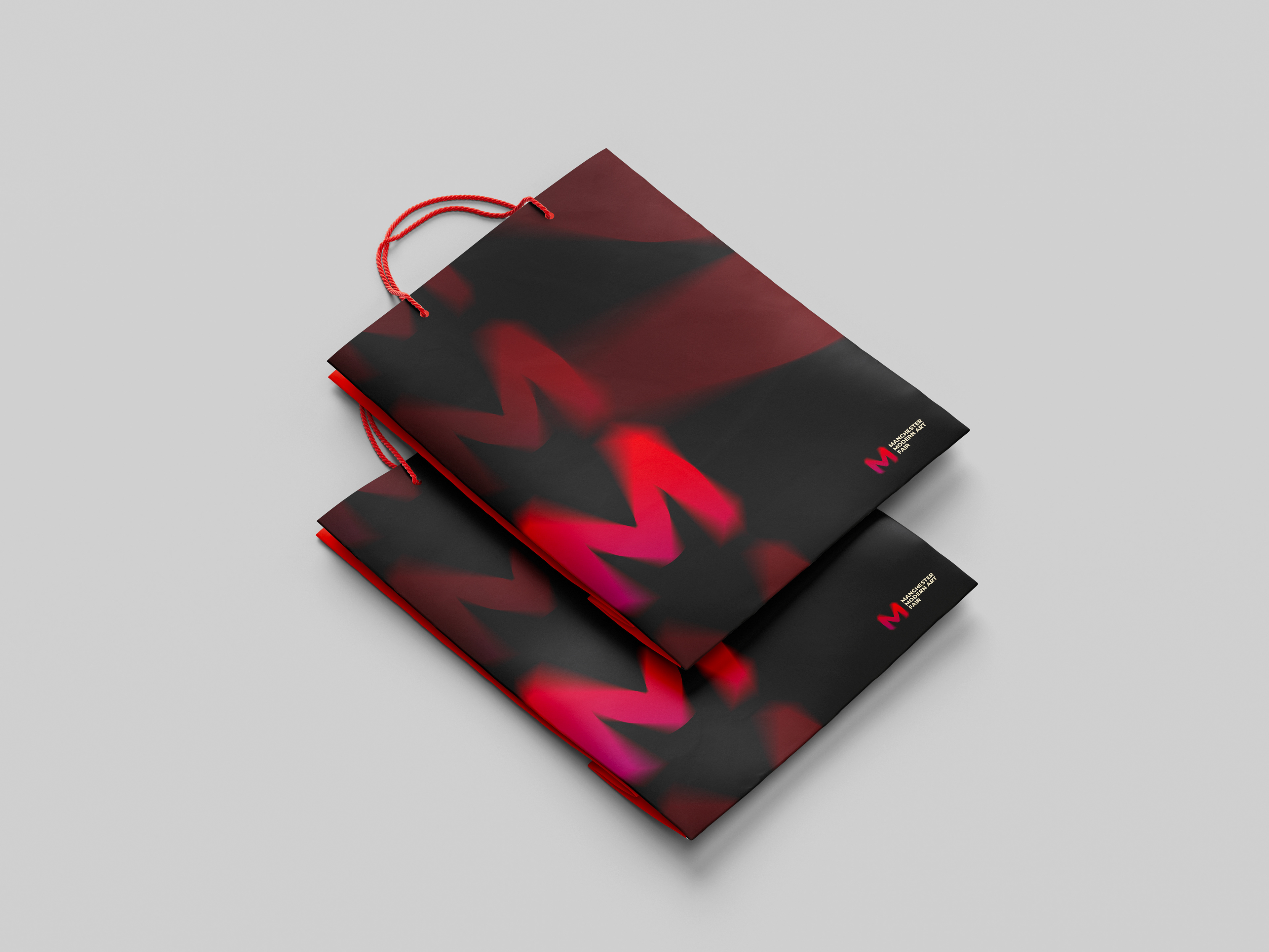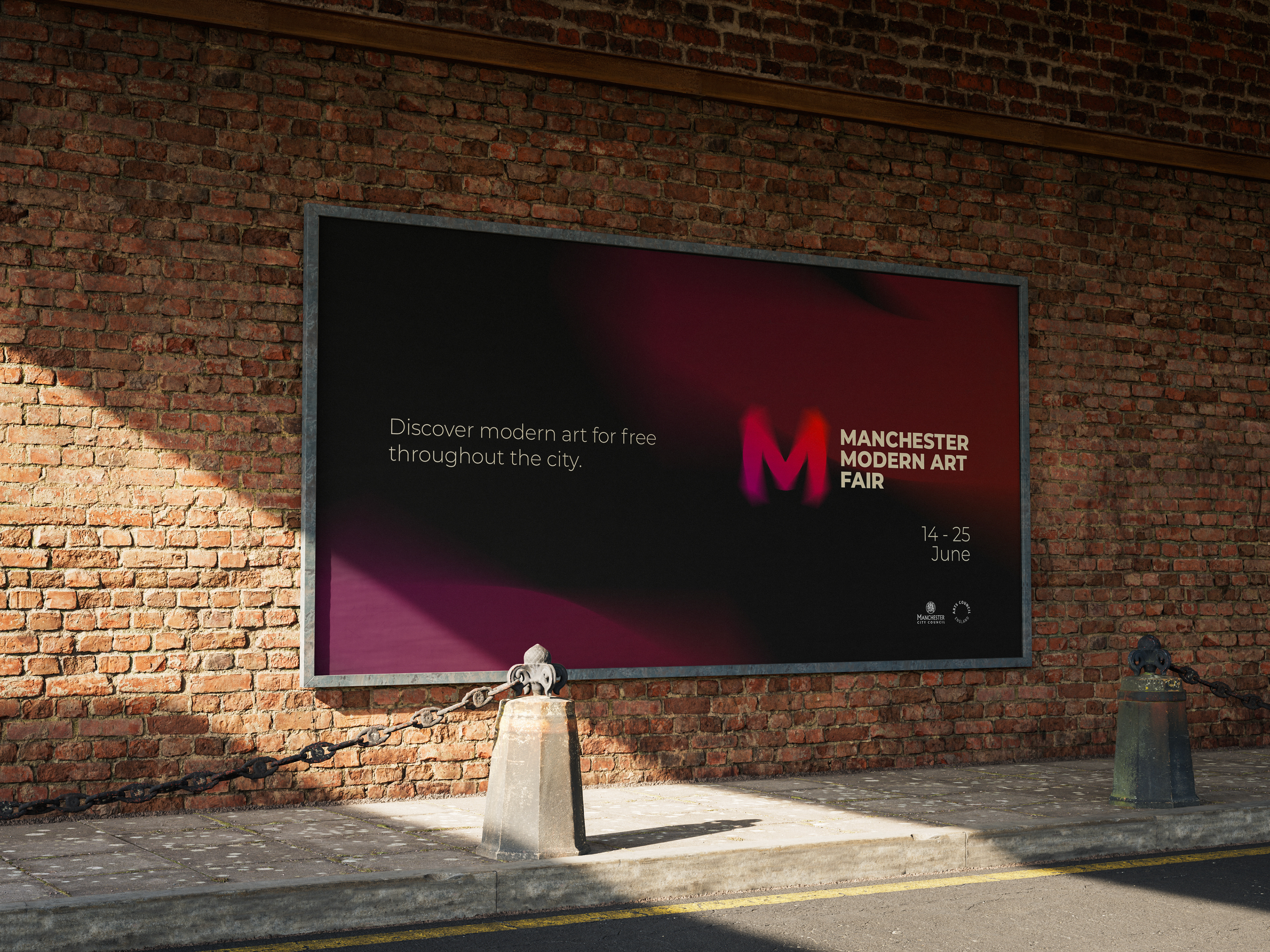 Ce projet de branding repose sur une identité visuelle audacieuse qui associe de larges dégradés de couleurs chaudes à un fond sombre, créant un contraste fort qui évoque l’énergie de l’art contemporain. La lettre « M » devient un symbole lumineux et abstrait, presque sculptural, qui se détache nettement dans chaque support et assure la cohérence de la campagne. La typographie, simple et sans empattement, renforce cette modernité tout en garantissant une excellente lisibilité à distance pour les dates et le nom de l’événement. L’utilisation de compositions épurées, avec beaucoup d’espace négatif, met en valeur les informations clés et laisse respirer les visuels, donnant à l’ensemble une esthétique à la fois urbaine, sophistiquée et accessible.
